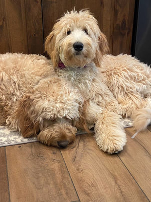 We are certainly proud of our adults. Crosby is our yellow F1 Golden Doodle, Harper is a F1B Red Golden Doodle. They are the JOY of our lives. Both featuring abstract coats with highs and lows of color, they are complimented daily!